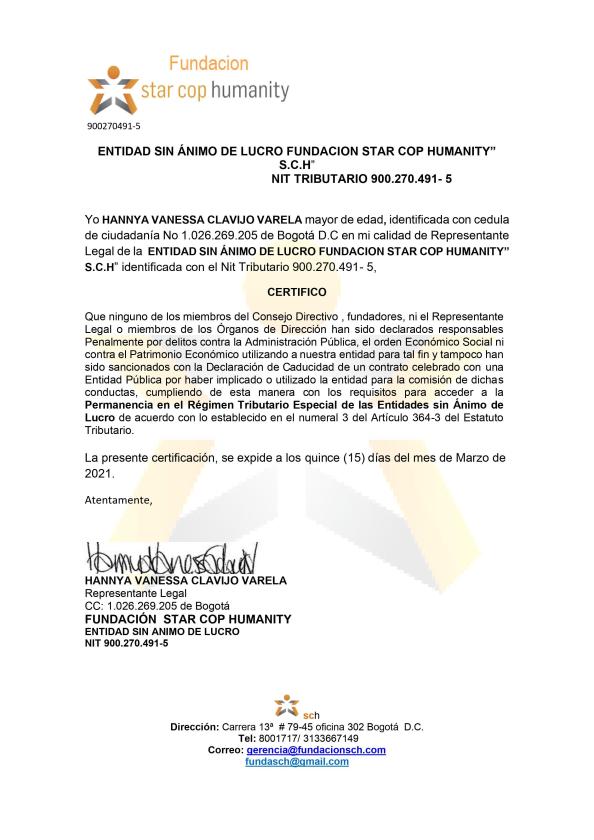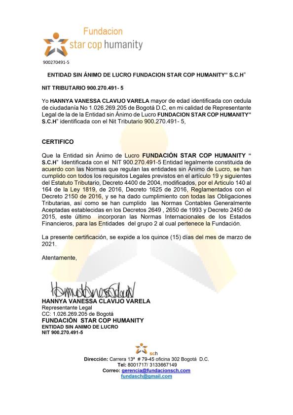 La Fundación Star Cop Humanity, en cumplimiento de lo establecido en el Artículo 1.2.1.5.1.5. del Decreto 2150 del 20-12-2017, hace pública la siguiente información para consideración de la comunidad.